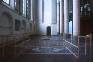 Voor het zingen de kerk uitgaan. De presentatievorm voor een groot aantal gepunnikte zaadcellen is geïnspireerd op een ‘bouwraam’. In het bouwvak gebruikt men dan hout en touw om de maten van een te bouwen object uit te zetten.