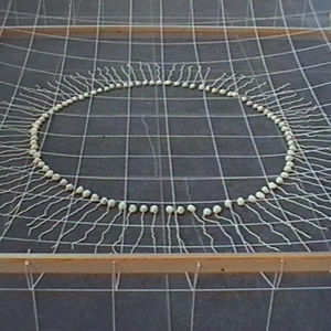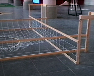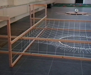 Bij een vlakke podiumvloer worden de begrenzingsdraden door het gewicht van de podiumdraden naar boven geduwd. De zijkant van dit podium moest echter overal even hoog blijven om de indruk van een vloertegelpodium te handhaven. De podiumdraden zijn nu zodanig opgehangen dat de begrenzingsdraden niet naar boven worden geduwd. De podiumdraden hangen dan wel door en vormen noodgedwongen een holgevormde podiumvloer waarbij alle krachten in volledig evenwicht verdeeld zijn.
