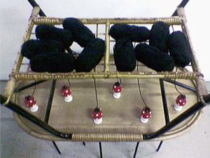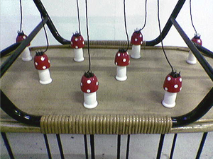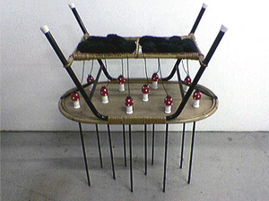 Toverachtig verschijnen in het kwadraat. Een rotan salontafeltje uit de 60-er jaren wordt ondersteboven gedragen door tien betoverde punnikslierten afkomstig van evenzoveel paddestoelen die onder het tafelblad ‘vegeteren’.