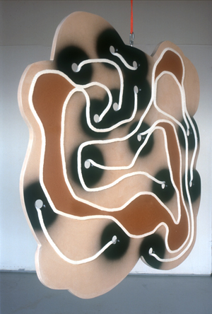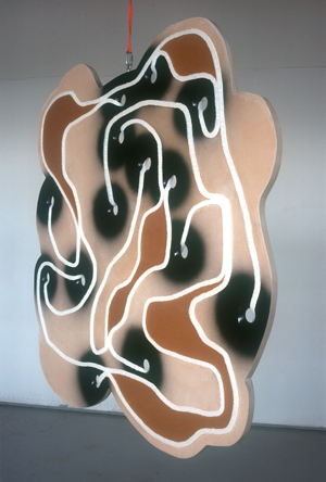 Punniken dan wel tekenen met ‘verf’. Een vertaalslag met siliconenkit van katoen of wol naar vloeibare massa. Met een kitspuit is de kit aangebracht op de voor- en achterzijde van een mdf-paneel.